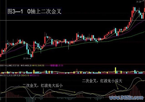 在0轴线上,白黄线出现“金叉”后,又出现“死叉”,但不下穿O轴线,几日后在O轴线上再次出现“金叉”,为“轴线上二次金叉”。此形态是主力洗盘所为,短暂盘整后,股价将上扬,可视为积极介入的信号。如果第一次“金叉“后的红波小(红柱短且不长),第二次红波大预示较好的买入时机。