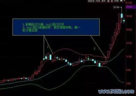 之前经历过一波大涨,BOLL的袋口也呈打开状态,当BOLL收口时,股价从中轨下方穿越上来,此时可能会发生新行情。