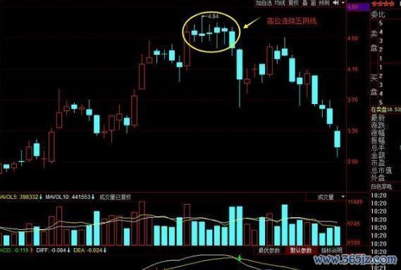 在高价位区连续出现五条阴线,同时伴有成交量萎缩,说明抛盘增多,多方已经无力推高股价,空方积蓄的能量即将爆发,后市必将下跌。
