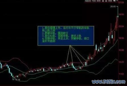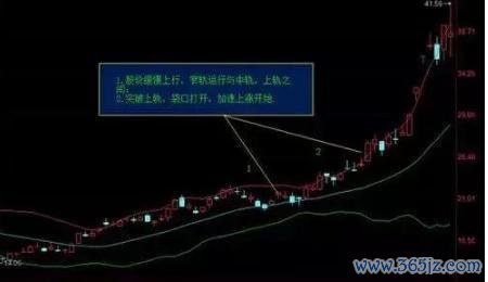 股价横盘震荡或缓慢上行,BOLL呈现平行窄轨,股价运行在BOLL的中轨和上轨之间,某日突然加速突破上轨,BOLL的袋口(上下轨)也呈打开的态势,此时发生行情的概率较大。