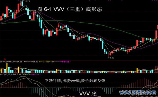 在O轴线下,股价下跌行情中,白线处于某一低点后向上,随后反复上涨下挫,其轨迹上基本在同一水平上形成“VVV底”(三重底)的走势,预示股价上升的趋势,当再次出现“金叉”时,既后(第三)底出现时,可确认为股价反弹,应果断买入。