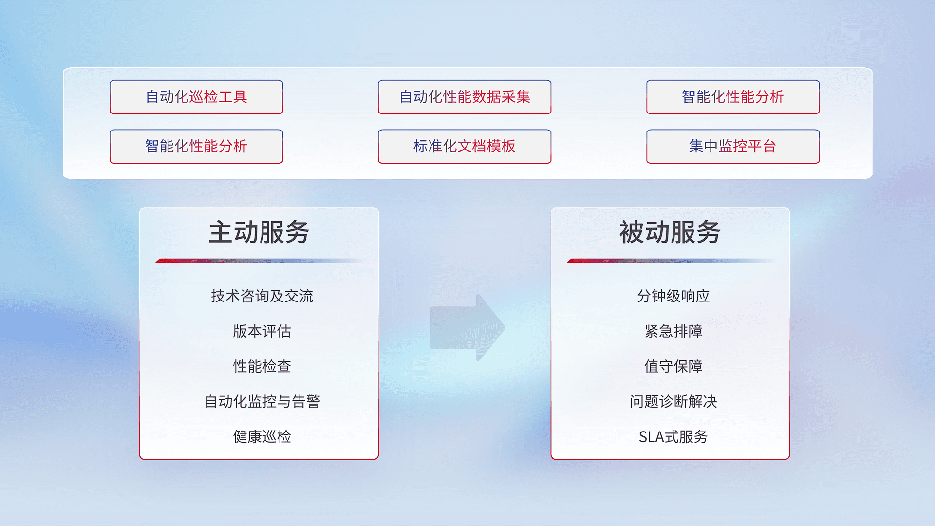 智能化工具和标准化文档,,,保障服务质量,,,提供主动服务(包含技术咨询、、、、版本评估、、性能检查、、、、自动化监控与告警、、、、健康巡检)和被动服务包含(分钟级响应、、、、紧急排障、、值守保障、、问题诊断解决、、SLA服务)。。。